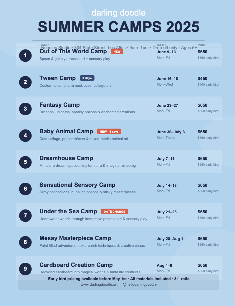Darling Doodle has lived in my heart for ages. I'm currently a second grade teacher in Los Altos with a deep passion for teaching and art. As a former preschool and kindergarten teacher, I've always believed in the power of creative learning. Back then, I'd often say, "we make big messes, and then we clean them up..." I love setting up invitations to create for the tiny humans.